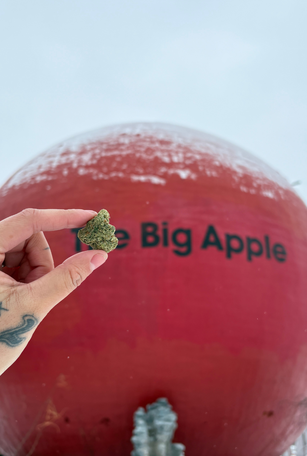 Bred by Seed Junky Genetics, Big Apple is a standout strain born from a cross of Apple Fritter and Sherb BX1, delivering both in potency and flavour. Its heart-shaped, dense nugs are coated in a frosty layer of trichomes, showcasing a striking appearance.
